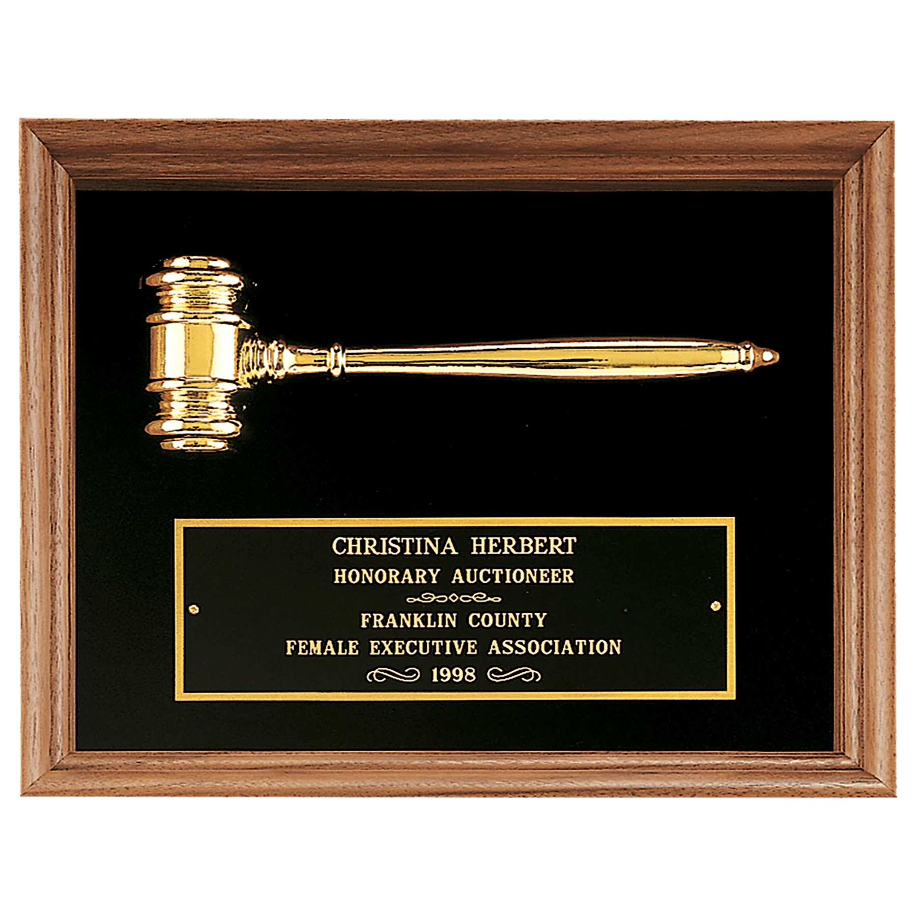 American Walnut Frame with Gold Electroplated Metal Gavel on Black Velour