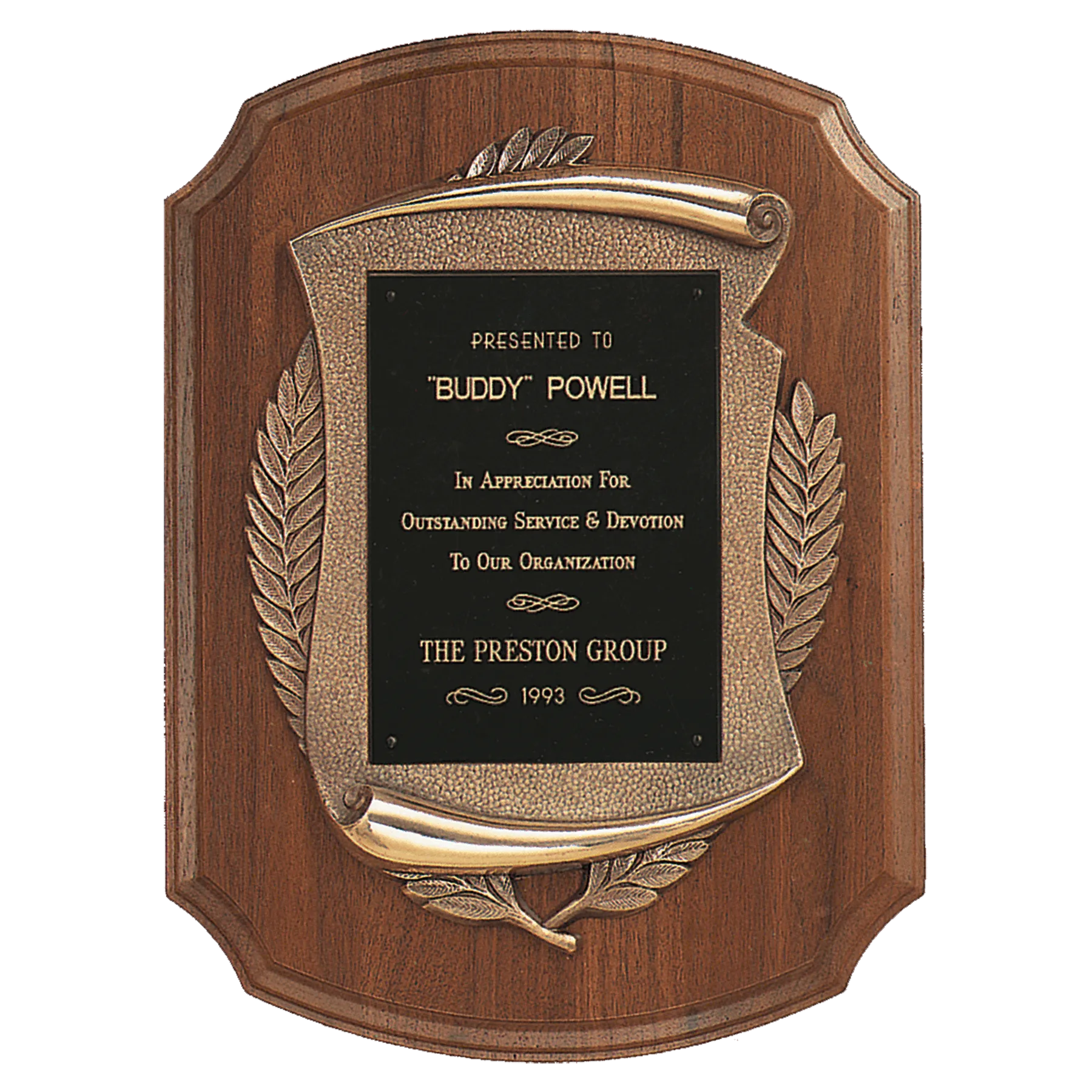 American Walnut Notch Corner Plaque w/Antique Bronze Scroll & Black Brass Plate