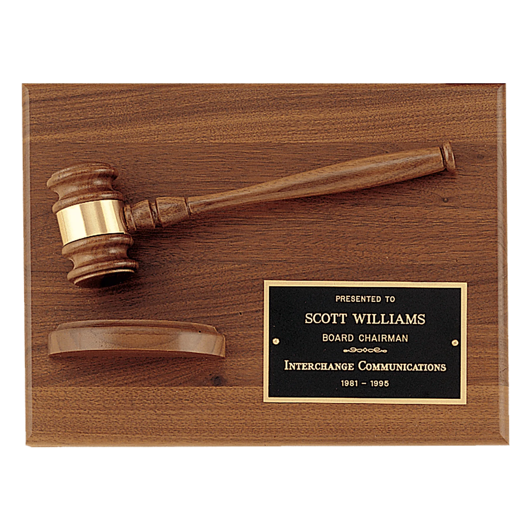 American Walnut Plaque with Walnut Gavel and Black Brass Plate