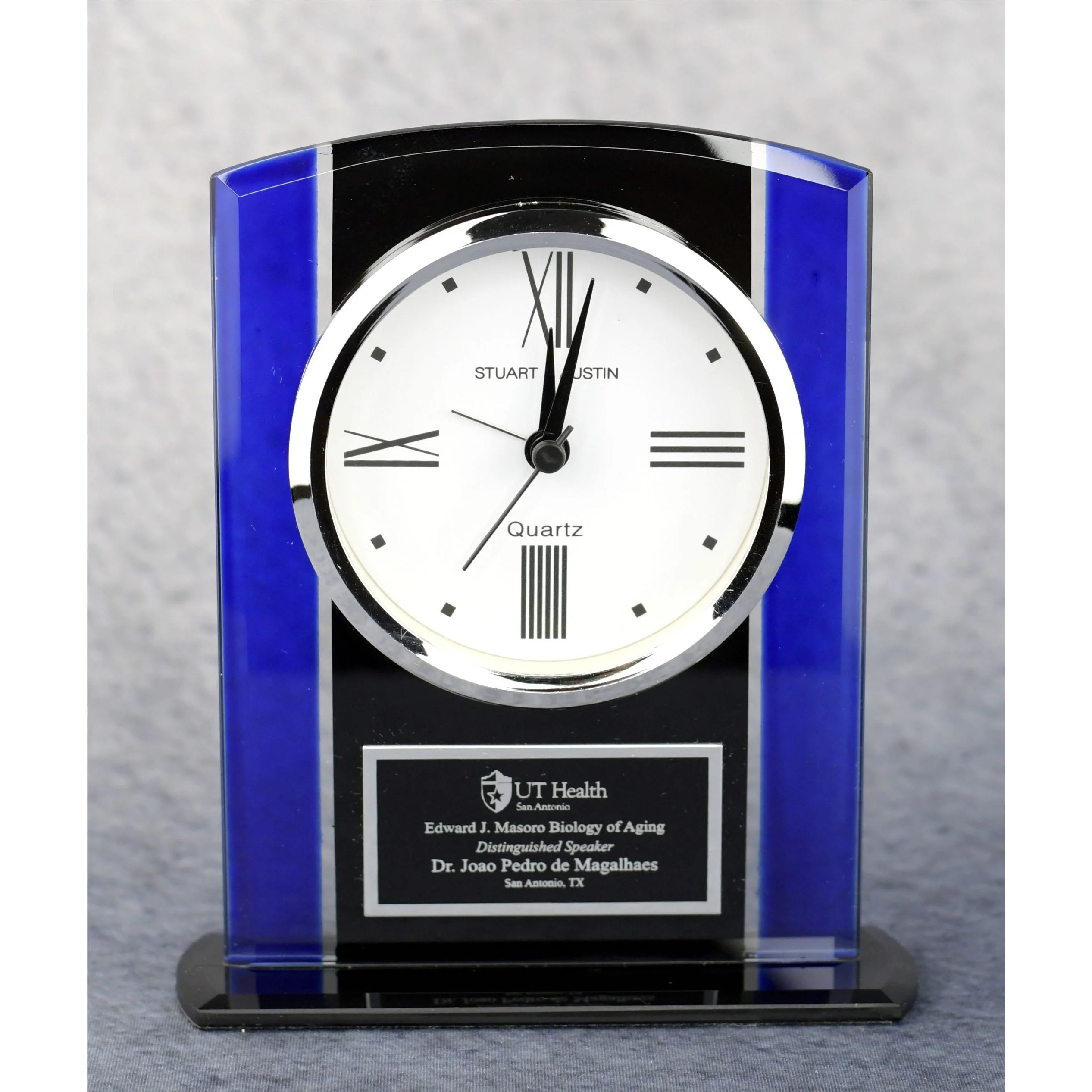 Beautiful, clear 6.25 inch arch clock with blue side accents and black base. Battery operated, three-hand movement clock with silver bezel, white dial with and black hands. Can be laser engraved with your unique message, company logo and the individual’s name.