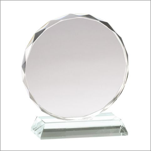 The award features a round shape with intricately cut facets that catch and reflect light beautifully. The faceted edges add a touch of elegance and brilliance, making it a striking centerpiece for any recognition event.